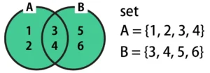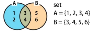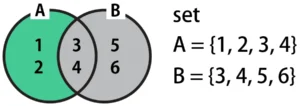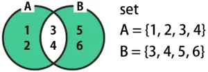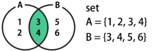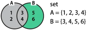 Both variables "A" and "B" share the common values {3, 4} (the overlapping area in the Venn diagram).